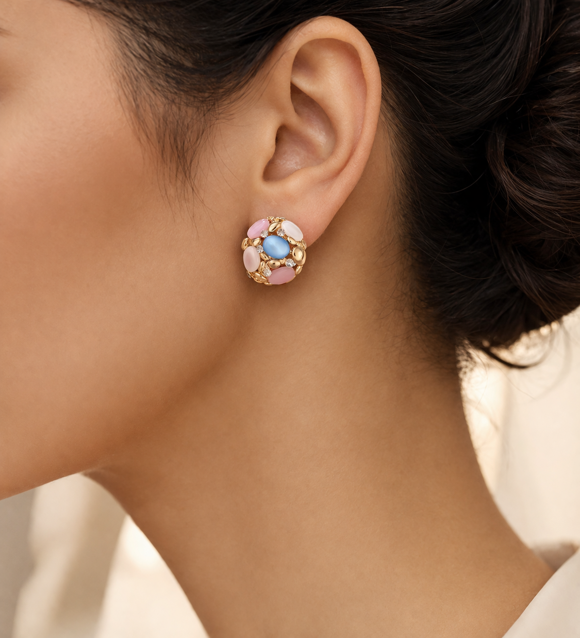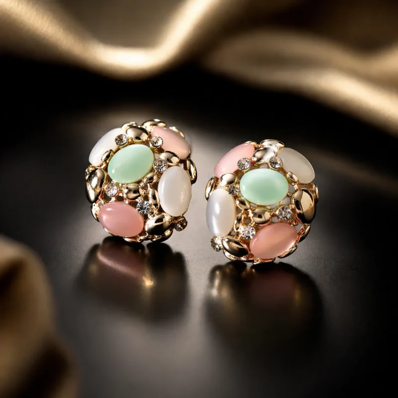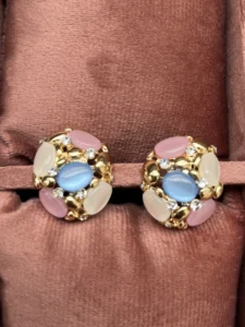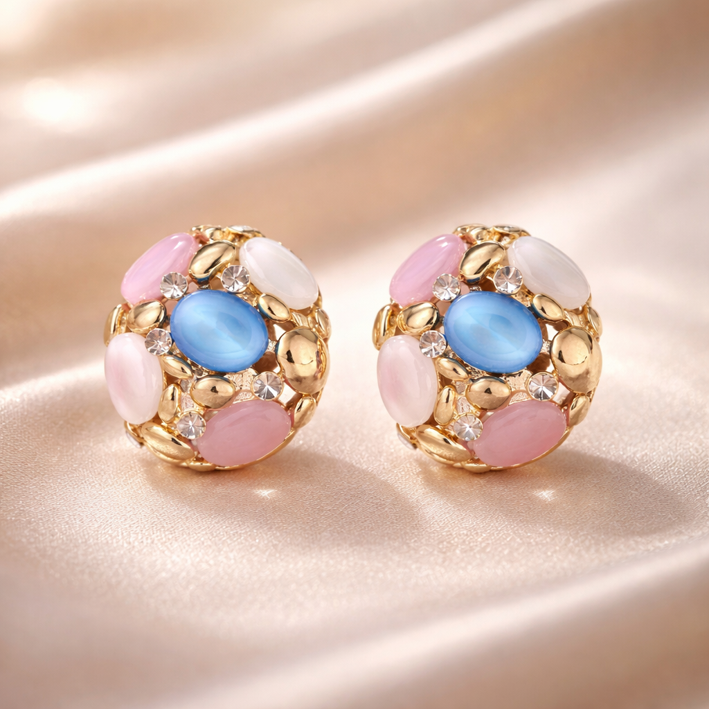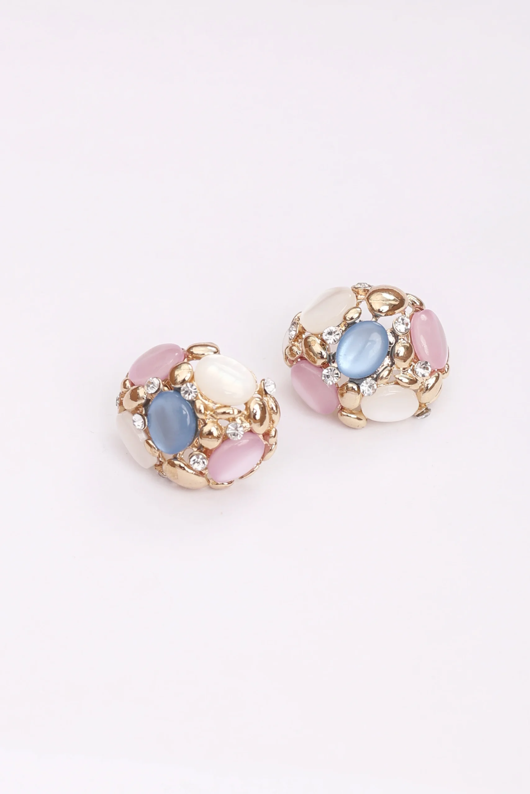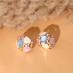 Bold and vibrant, these coral stud earrings feature a striking mix of Light Blue, blush pink, and creamy ivory stones accented with shimmering Rhinestone. Each earring is accented with tiny, sparkling clear rhinestones set in a gold-toned metal base, creating a charming and sophisticated look suitable for both Casual and Party occasions.