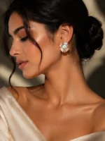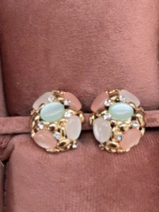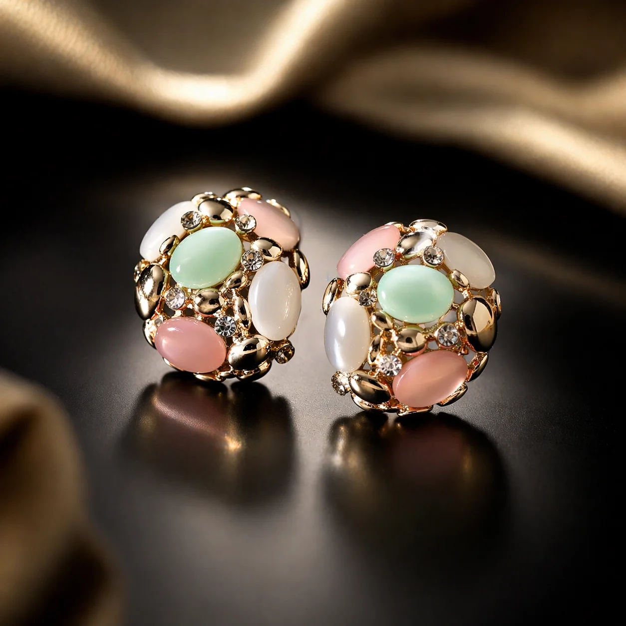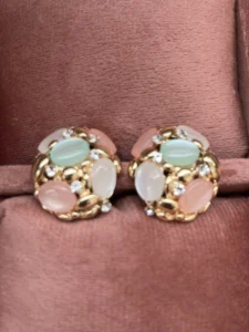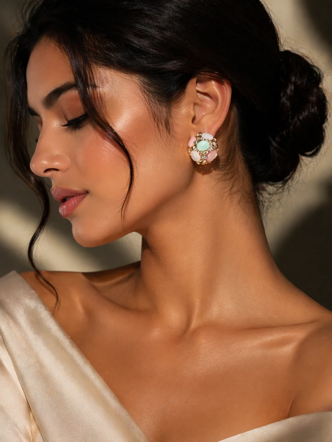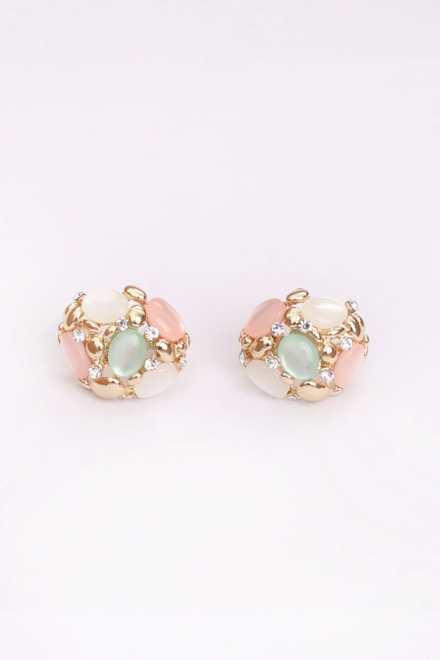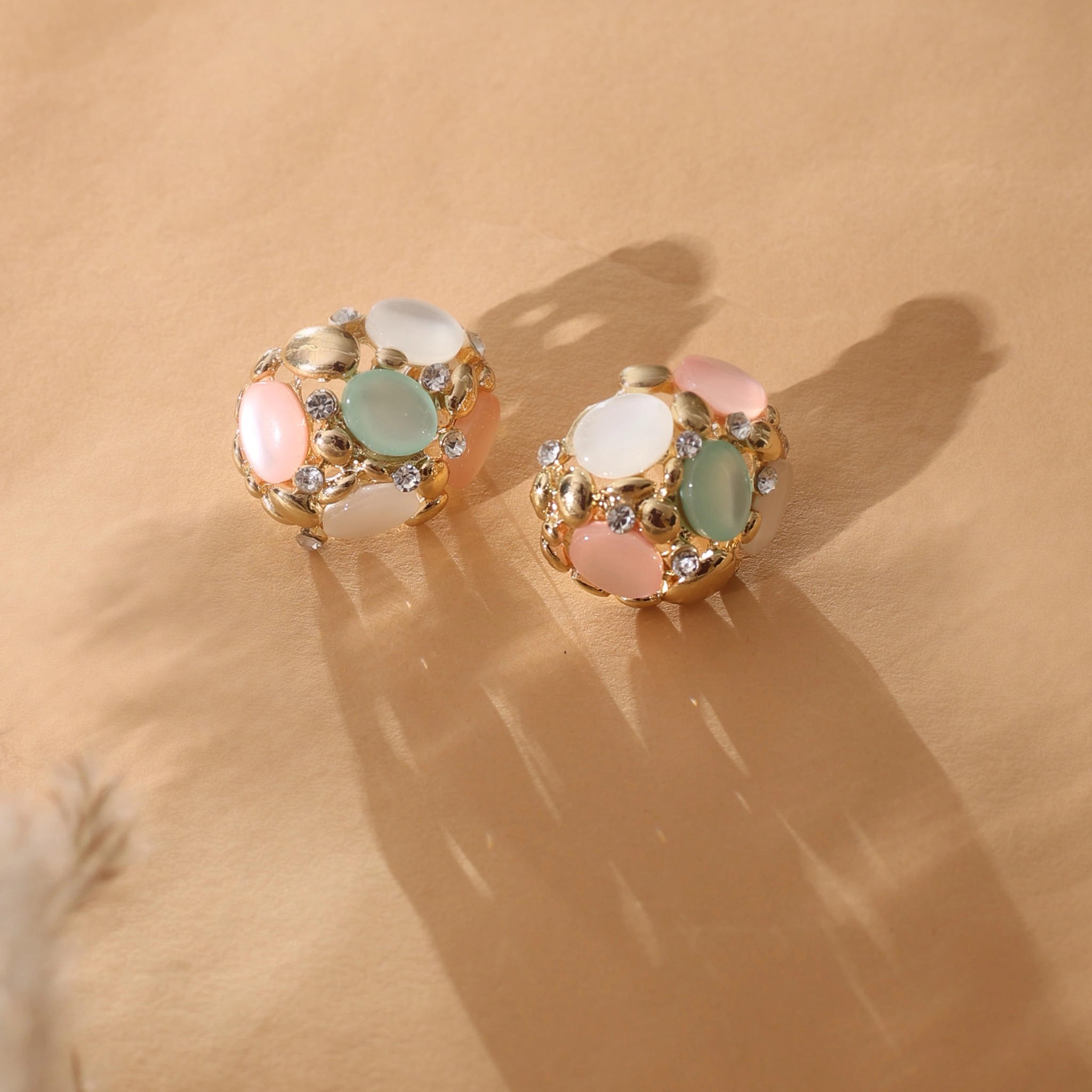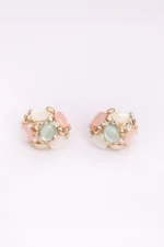 Bold and vibrant, these coral stud earrings feature a striking mix of Mint Green, blush pink, and creamy ivory stones accented with shimmering Rhinestone. Each earring is accented with tiny, sparkling clear rhinestones set in a gold-toned metal base, creating a charming and sophisticated look suitable for both Casual and Party occasions