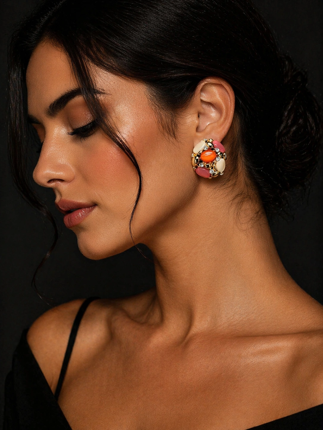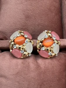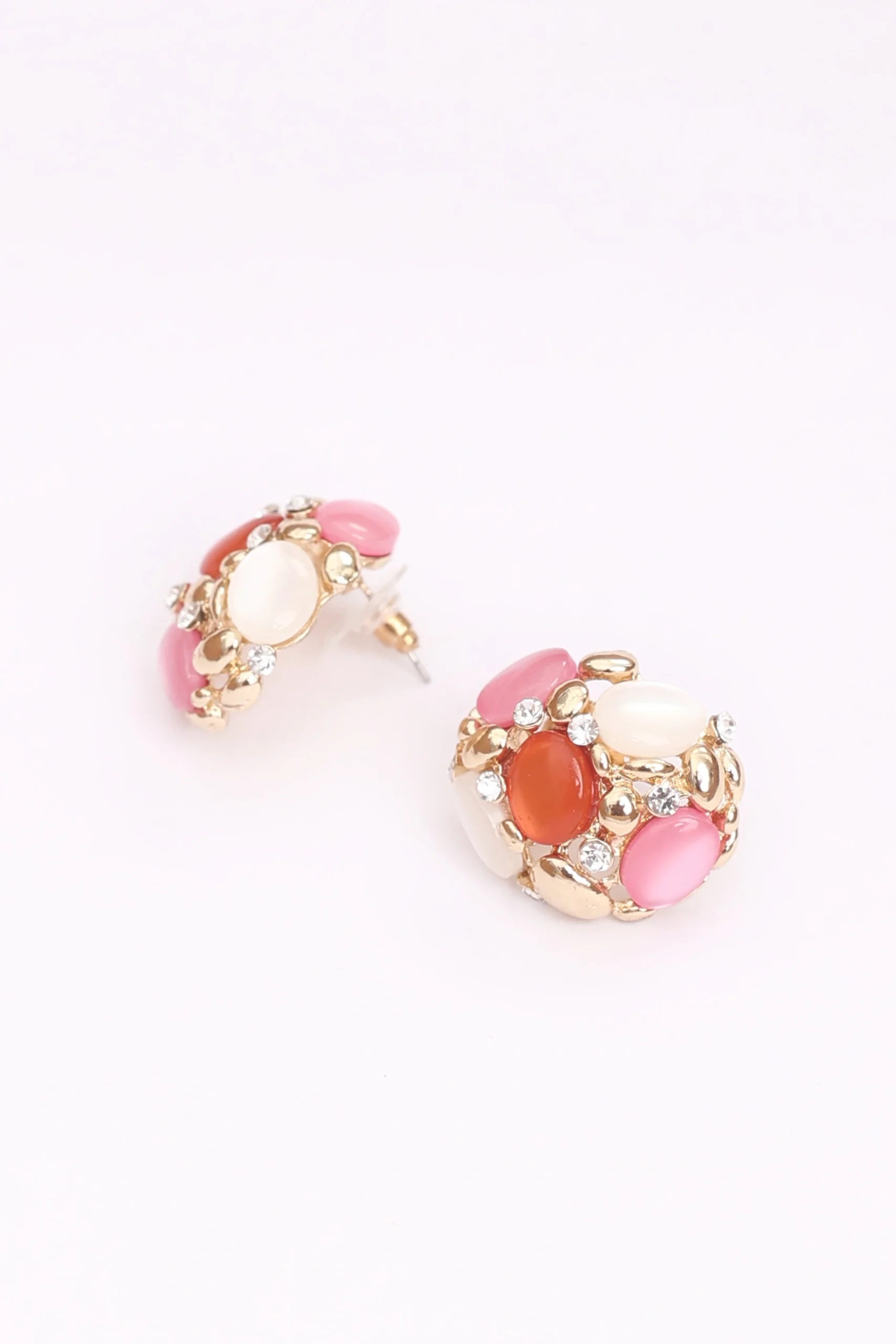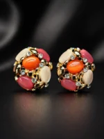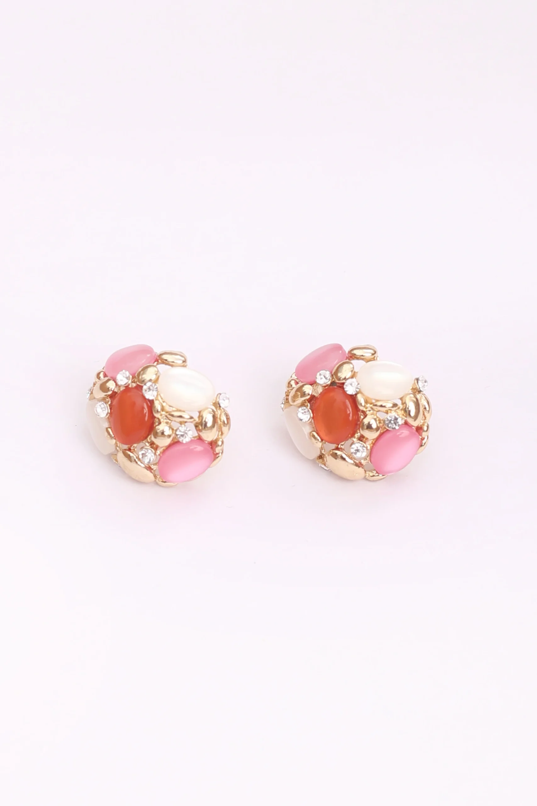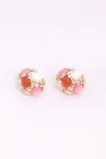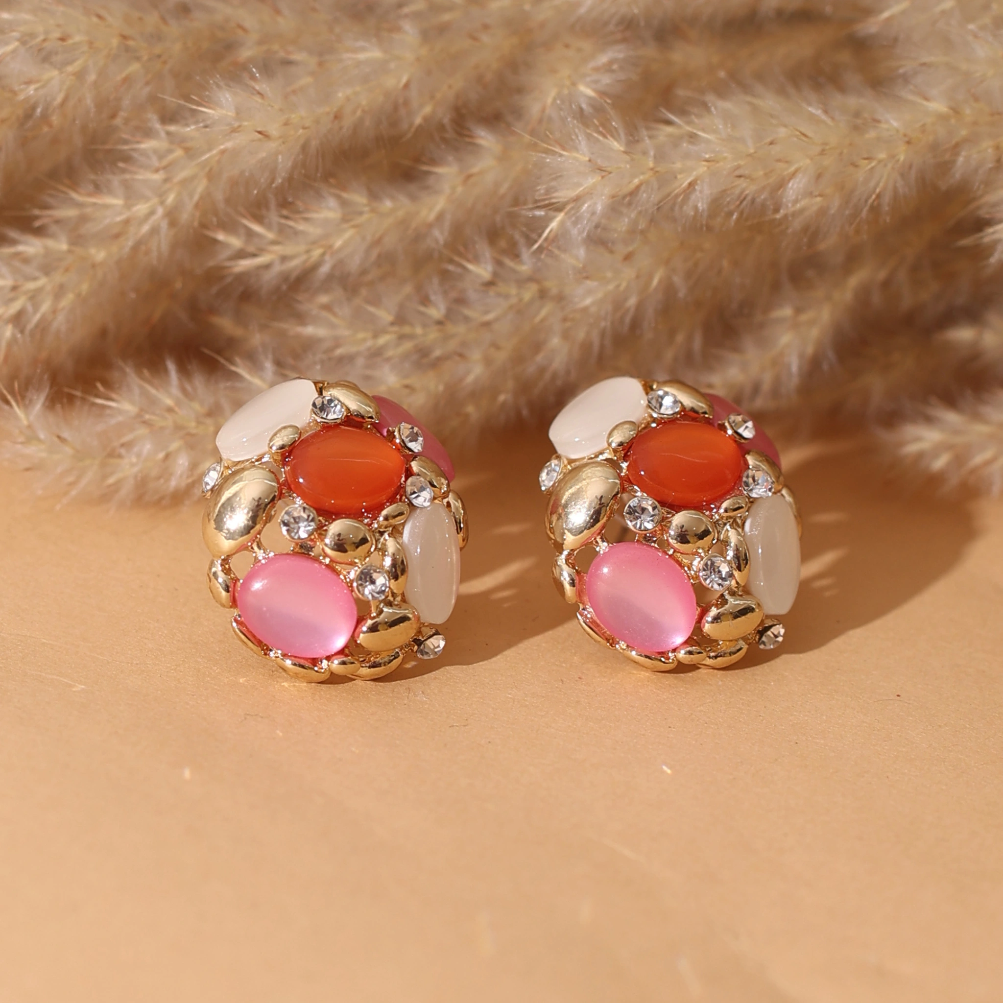 Bold and vibrant, these coral stud earrings feature a striking mix of coral orange, blush pink, and creamy ivory stones accented with shimmering Rhinestone. Each earring is accented with tiny, sparkling clear rhinestones set in a gold-toned metal base, creating a charming and sophisticated look suitable for both Casual and Party occasions