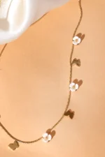 A charming gold-tone necklace featuring delicate white enamel flowers paired with graceful butterfly charms, perfect for adding a soft, feminine touch to any outfit.