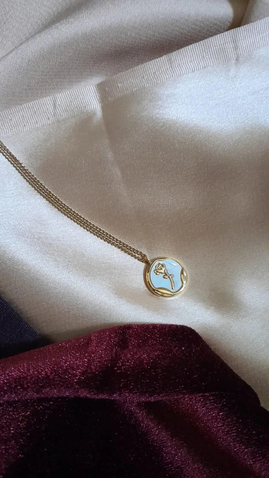 A timeless round pendant necklace featuring a delicate golden rose motif set on a glossy enamel base, symbolizing elegance, love, and grace. Perfect for everyday wear or as a meaningful gift.