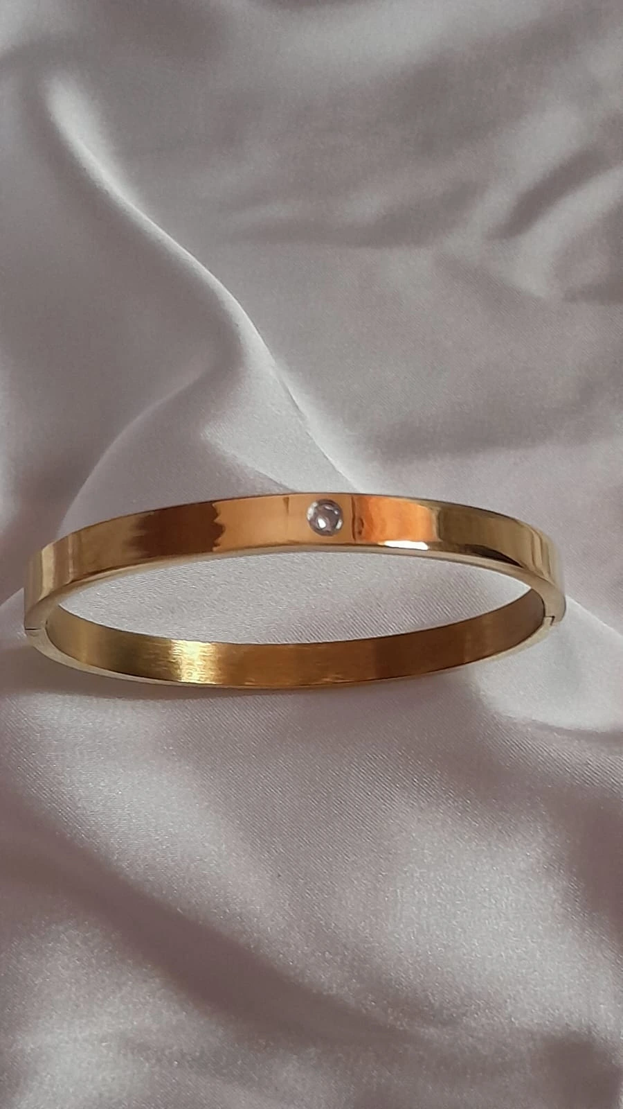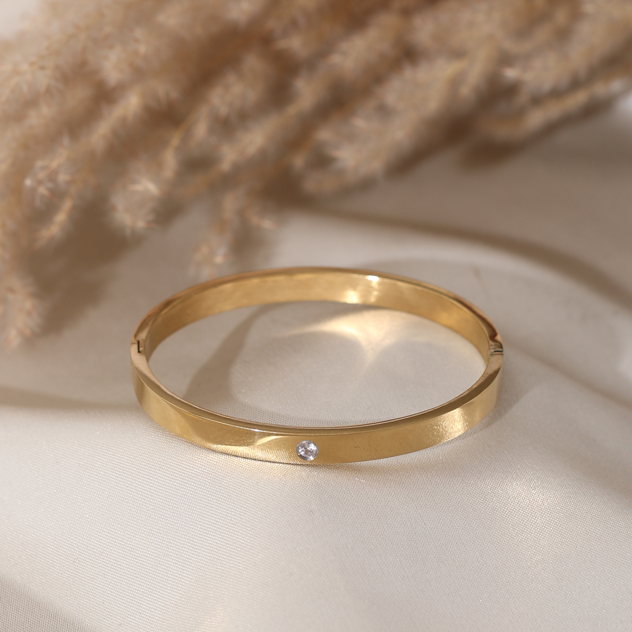 Add a touch of timeless elegance to your look with this beautifully crafted gold-plated bangle. Made from durable stainless steel and finished with a high-shine polish, this piece features a minimalist design elevated by a single sparkling cubic zirconia at its center.