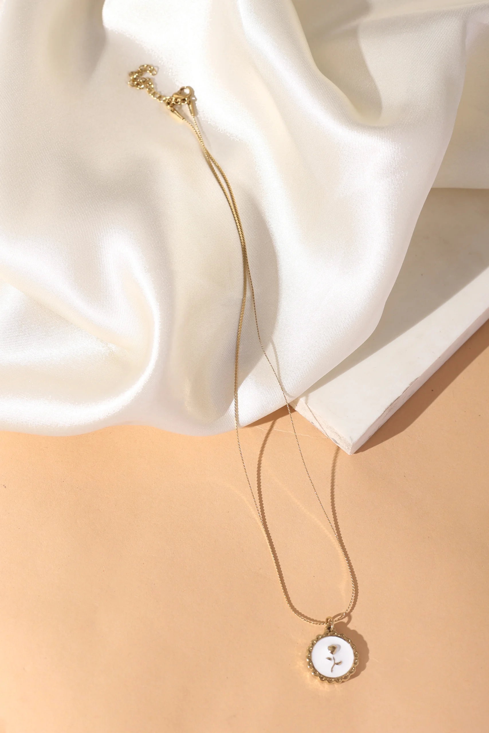 Features a delicate gold-toned chain with a beautiful circular pendant showcasing a minimal golden flower design on a white enamel base.